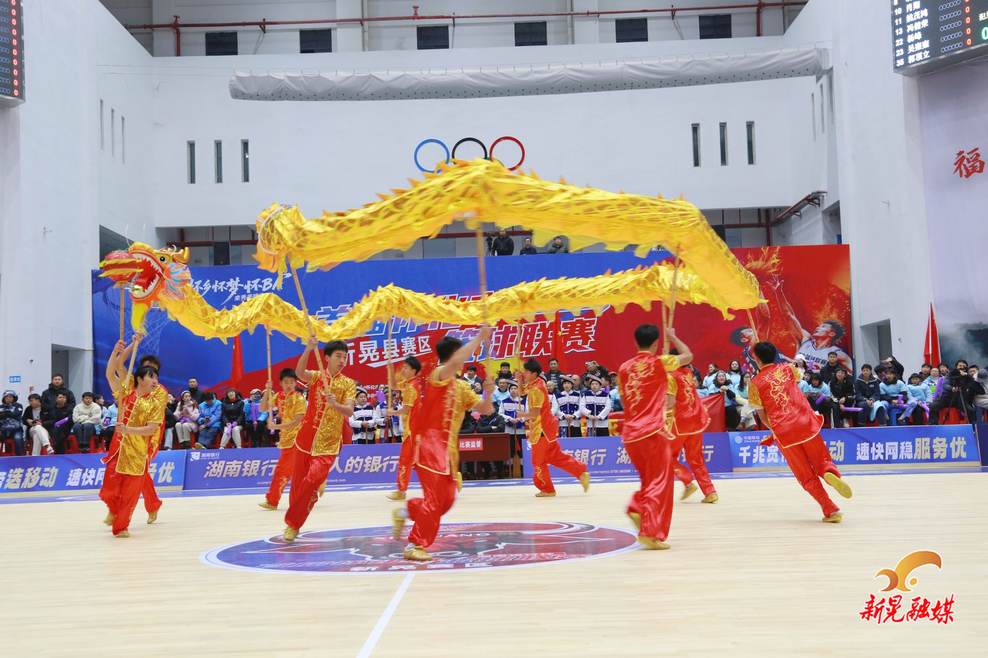 当晚的赛场,未赛先热。新晃一中舞龙队率先登台亮相,经典表演《中国龙》惊艳全场。伴随着激昂的节奏,金龙时而腾空而起、昂首啸天,时而盘旋游走、灵动摆尾,队员们默契配合,将龙的威严与活力展现得淋漓尽致,让千年龙文化在赛场之上焕发新生,引得全场观众掌声雷动、笑颜绽放 。