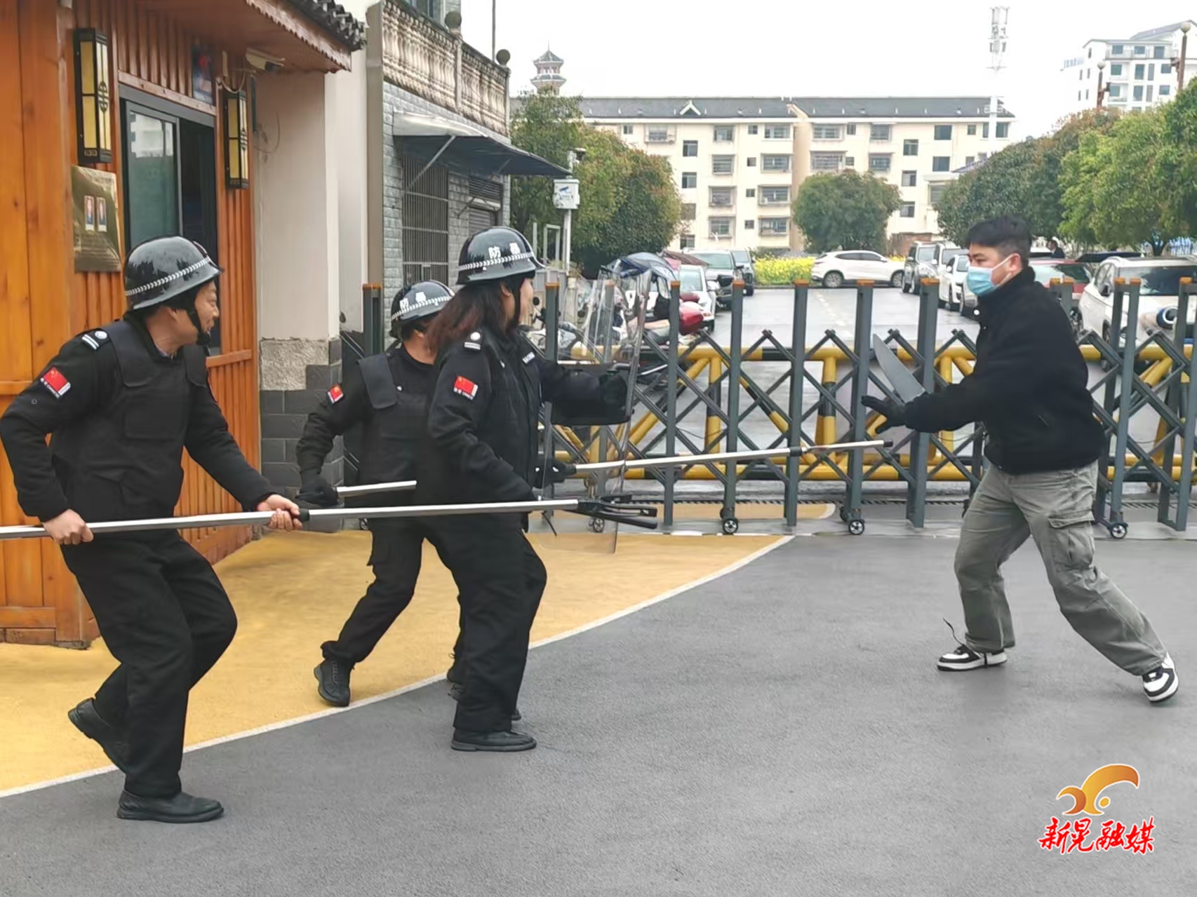 演练现场,一名由工作人员假扮的“歹徒”冒充维修人员,试图强行闯入校园。当班保安立即启动一键报警装置并迅速持防暴器械上前周旋。园内随即响起应急警报,户外活动的幼儿在老师带领下迅速疏散至教室躲避。与此同时,保安运用“三人最小作战单元”战术,利用盾牌、钢叉等器械成功将“歹徒”制服。整个演练过程紧张有序,各小组响应迅速、配合默契。