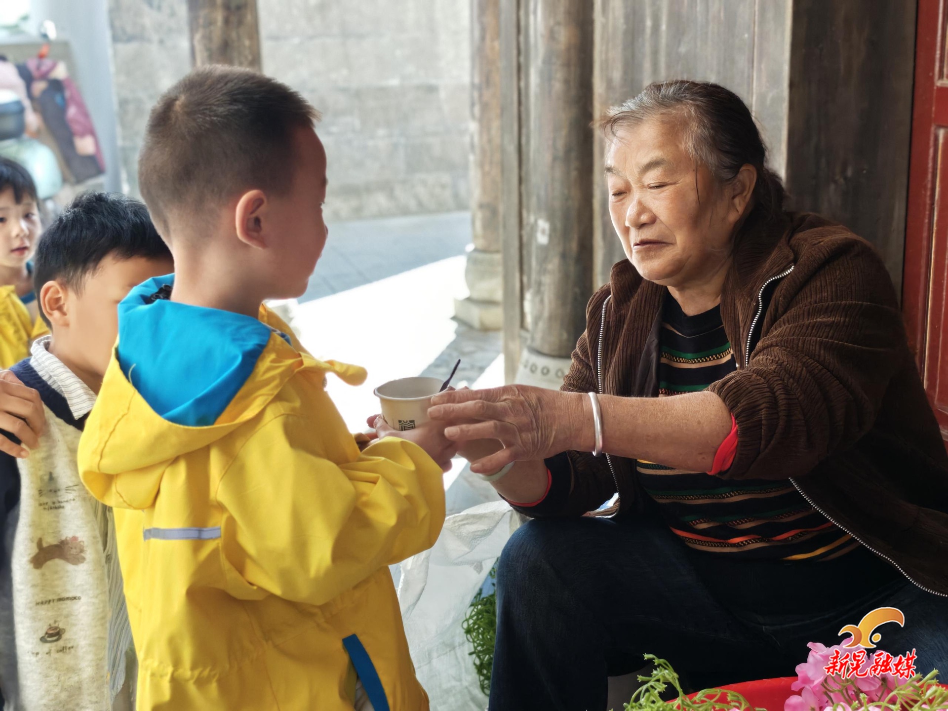 此外,幼儿们还将丰收的红薯赠与社区老人和同行的爷爷奶奶,祝愿老人们健康长寿、重阳节快乐。