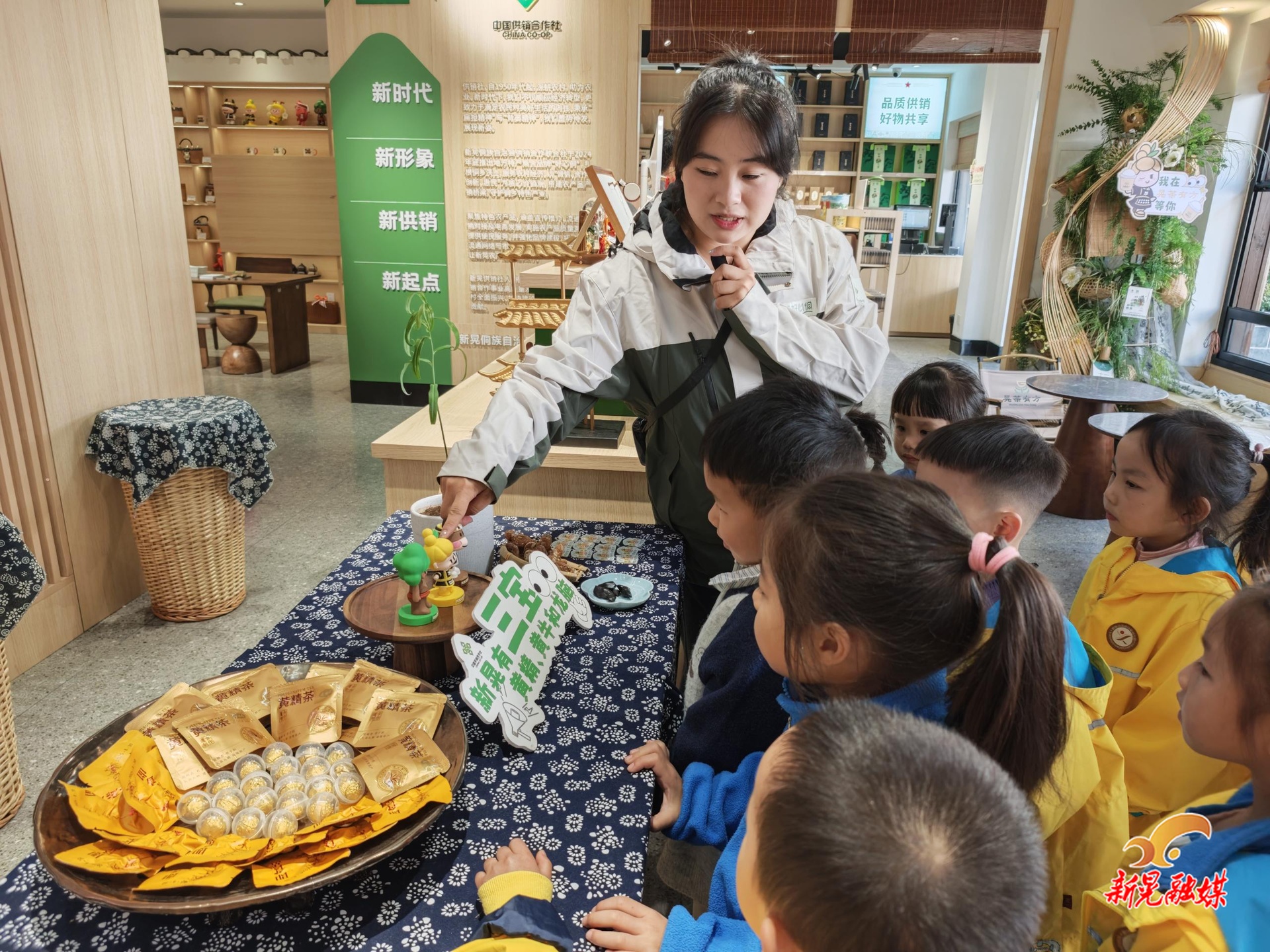 在“新晃三宝”供销臻选龙溪店,幼儿参观各类黄精产品,了解黄精生长习性和黄精产品养生功能。工作人员现场制作黄精奶茶、黄精茶、黄精甜酒,幼儿品尝后相互交流饮用体验。随后,幼儿们在教师的陪同下,将自己亲手准备的黄精茶,送给在古镇周边散步、休息的老人。