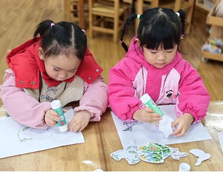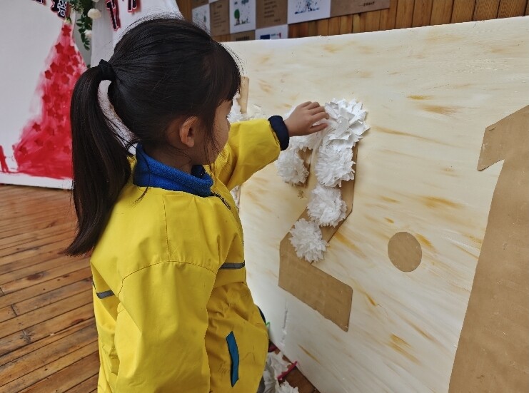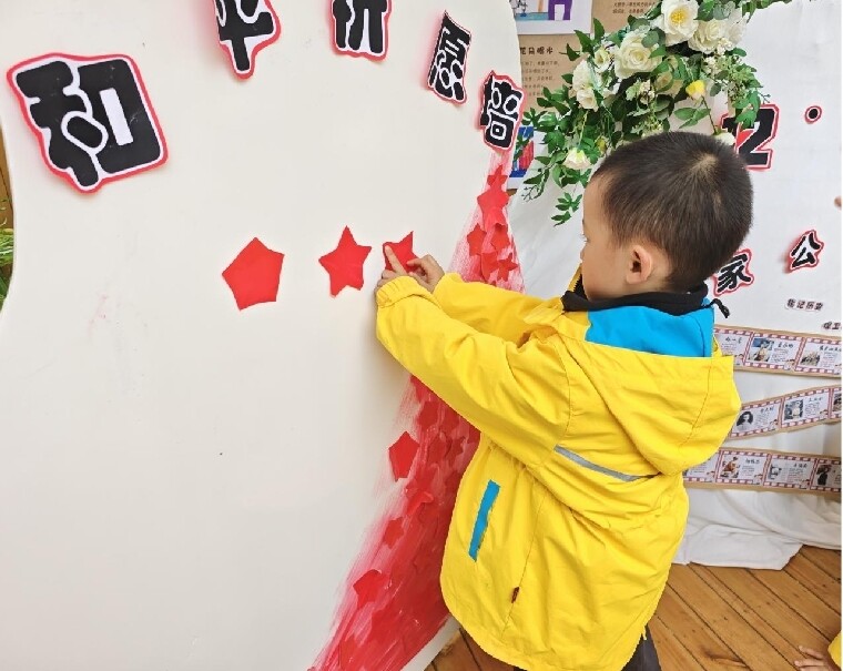 随后,孩子们分组制作纸花寄托哀思,并陈列于幼儿园“和平角”进行简单悼念;剪制“和平星”并写上心愿,汇聚成幼儿园的“和平约定”墙。