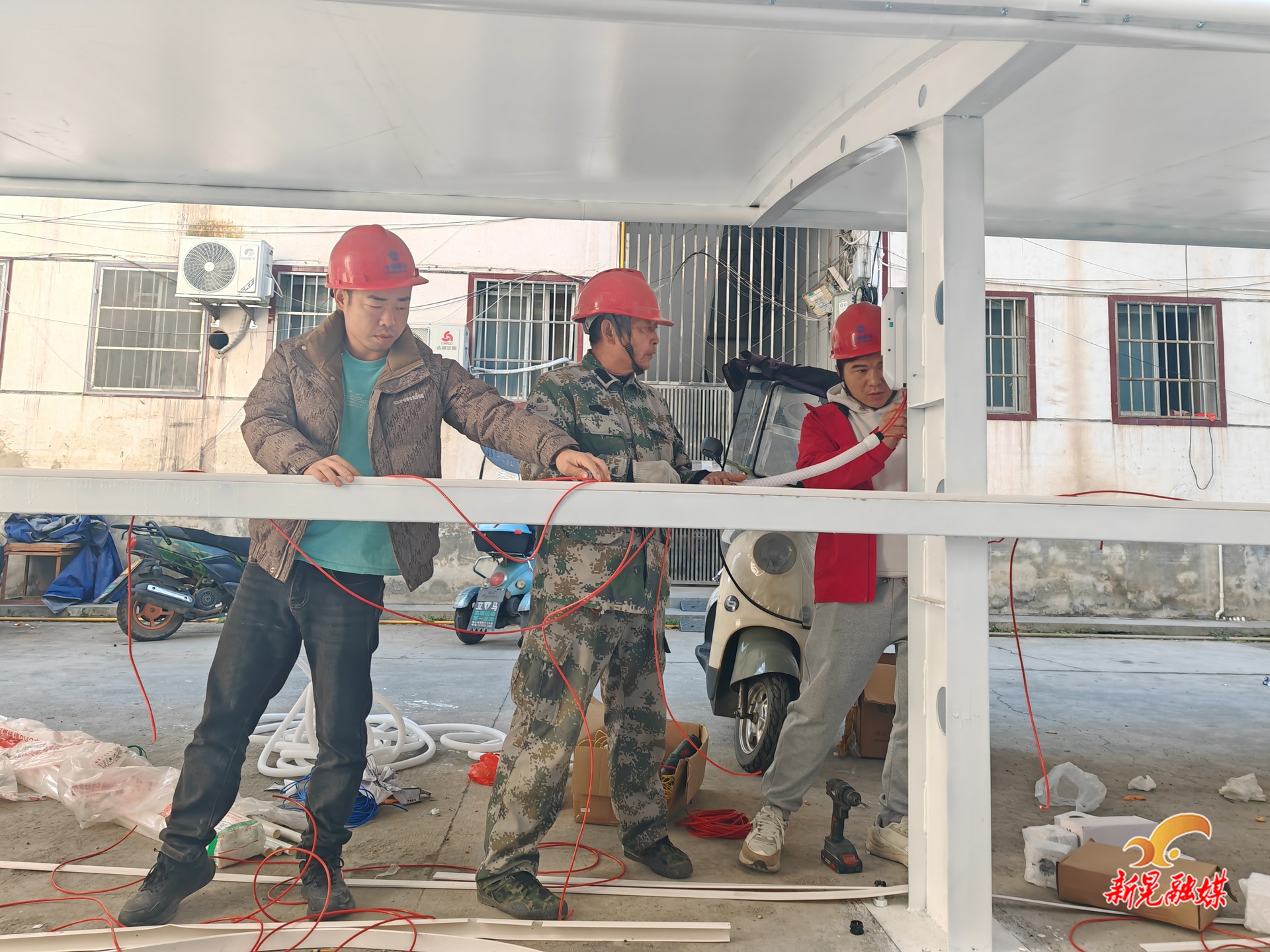 在环卫所宿舍施工现场,崭新的白色充电棚已然立起,工人们正有序安装充电插座以及智能控制器,并进行规范的线路铺设,使用充电钻将零线、火线接入智能控制器。