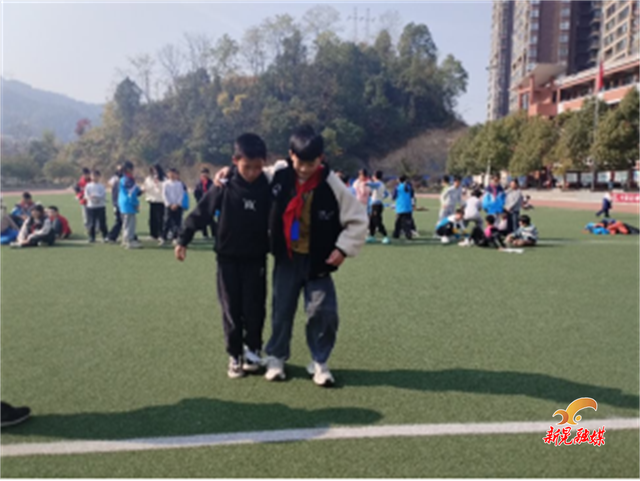 活动以趣味 “听令行动” 拉开序幕。同学们手拉手围圈,跟着老师口令互动,挑战“口令心非”,大家在轻松氛围中锻炼了反应能力,也感受到包容的温暖。在随后的“两人三足”友谊赛现场,同学们抽签分组,两人绑腿并肩前行,齐声喊着 “一二、一二” 的口号。有的小组步伐协调,快速冲线;有的虽摇摇晃晃却始终携手不放,与同伴坚持前行。