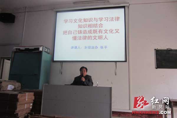 红网新晃站9月24日讯 (蒲师德 关仕尤 段君侠) 24日下午,禾滩中学邀请禾滩乡派出所、综治、安监、司法等部门负责人,为全体师生进行了一场生动的法制知识讲座。