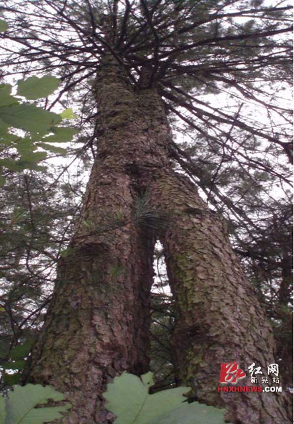 红网新晃站9月25日讯 ( 潘光镜) 近日,笔者在距凉伞集镇2.5公里的桂镇村山中,发现两株高大、茂盛的松树中部相互交合融为一体。大自然的神奇魅力竟使这对树木“和谐相拥”、“生死相依”,实在令人惊叹和联想。