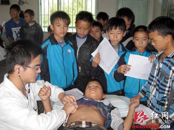 图为医务人员为学生进行内科检查。