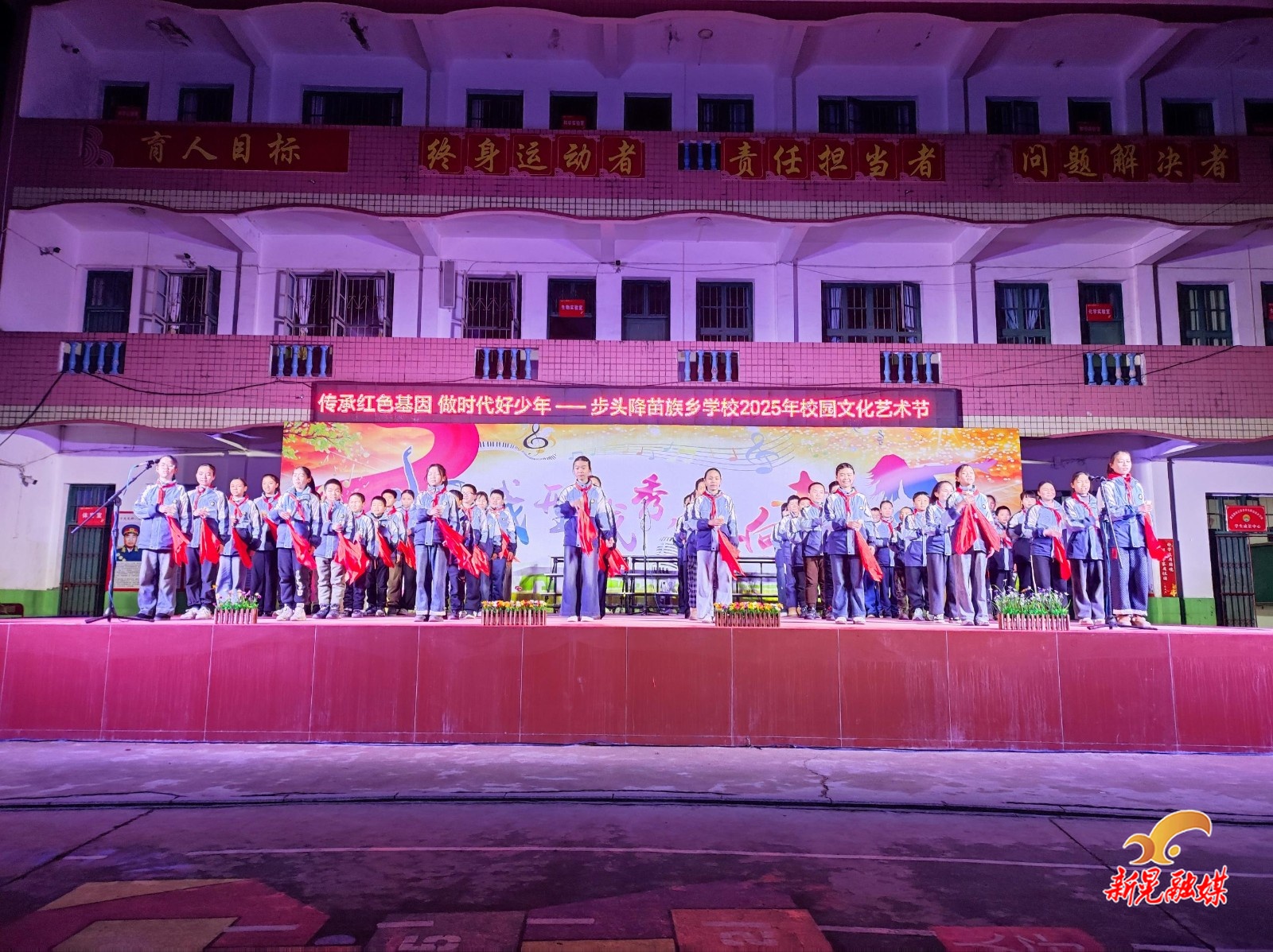 “书画筑梦”环节,师生们的作品或勾勒家乡苗寨的秀丽山水,或书写少年意气的远大理想,或描摹革命先辈的峥嵘足迹。笔墨流转间,是传统文化的薪火相传;色彩晕染中,是红色基因的赓续和绵延。“经典诵读”环节,同学们以饱满的热情齐声朗诵《沁园春·雪》,铿锵的语调、豪迈的气势,尽显少年一代志存高远的壮志豪情。“唱响中国”环节,《少年少年祖国的春天》等经典曲目响彻校园,激昂的歌声里,满是对祖国母亲的深切热爱,对美好未来的无限憧憬。苗乡风情歌舞、现代器乐演奏、传统技艺展示等相继上演,充分展现该校素质教育的丰硕成果,勾勒出师生多才多艺、全面发展的生动画面。