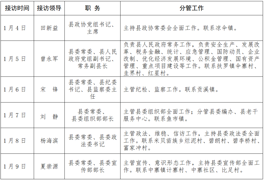 5.接访安排可能因工作冲突等原因进行调整。具体调整情况将在县群众信访接待中心公告栏公告。