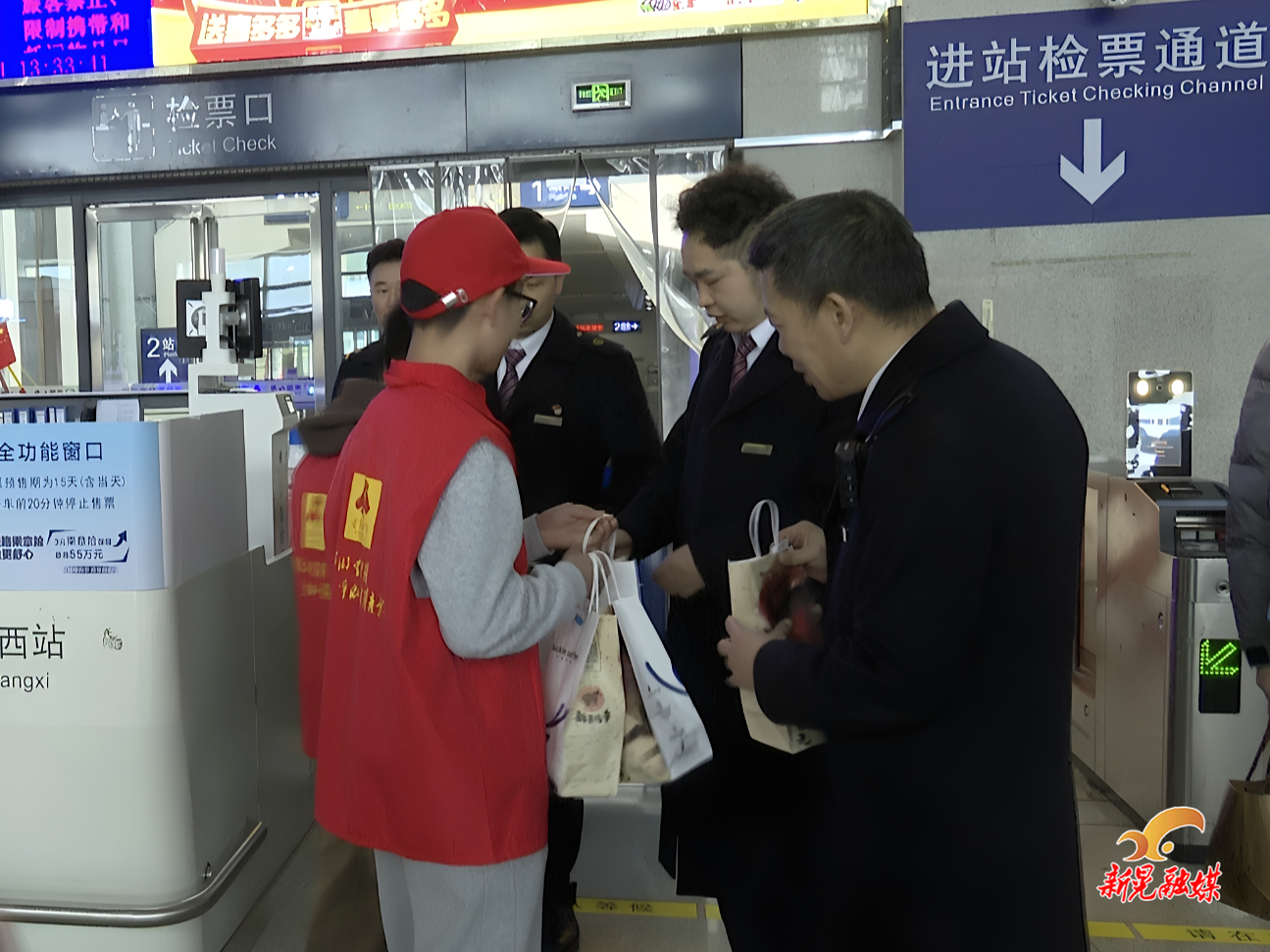 新晃融媒2月25日讯(记者:杨清廉)2月24日,正值春运返程高峰,县委社会工作部、团县委、新晃微爱志愿者协会、新晃同心公益社会工作服务中心,组织大学生志愿者及雷锋青少年代表,走进高铁新晃西站和新晃西站派出所,开展“一杯热饮暖人心 致敬坚守护春运”主题慰问活动,向坚守在春运一线的执勤警务人员及高铁站工作人员送去热饮和新春祝福。