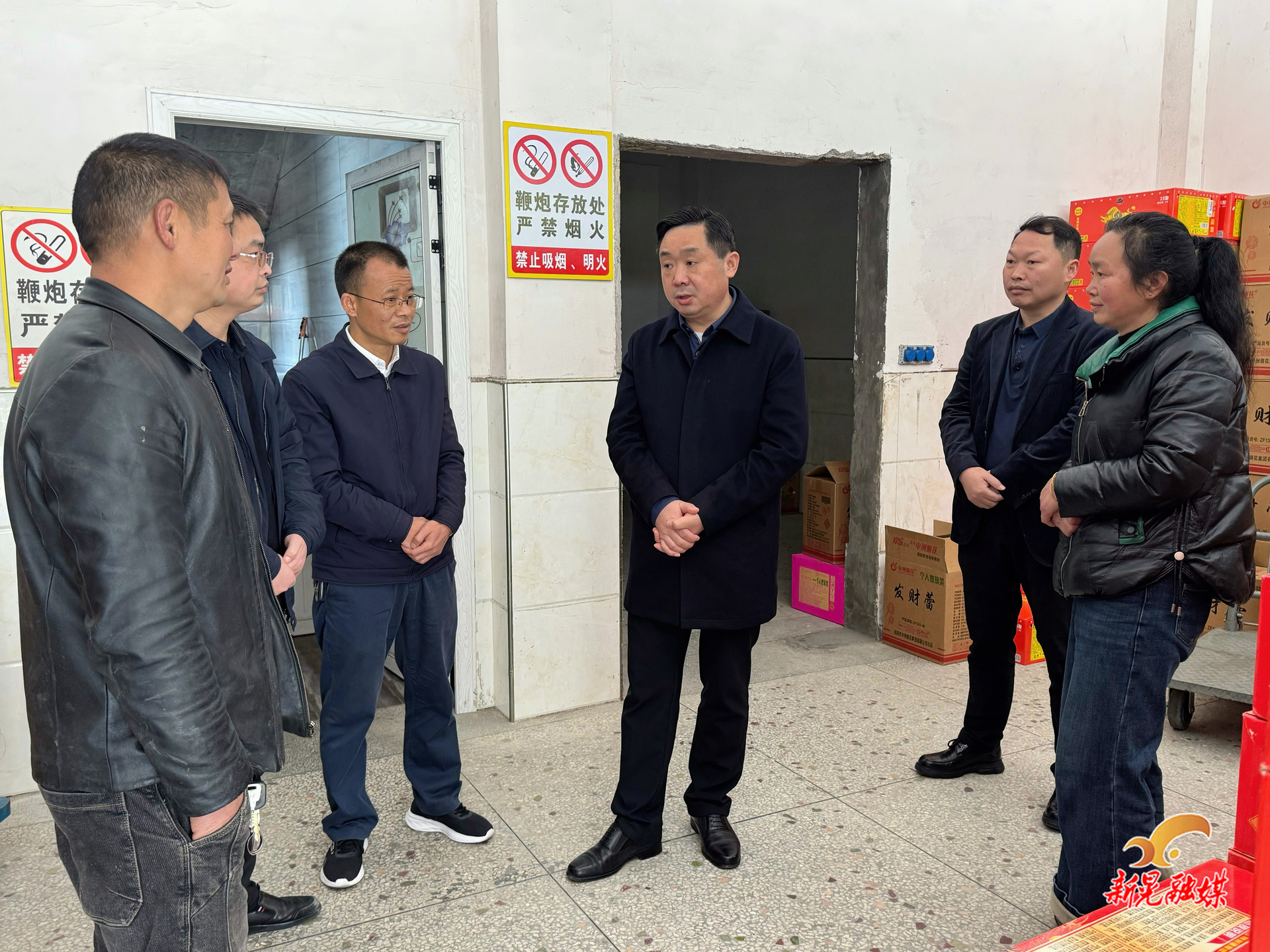 在丁字坳向红梅烟花爆竹经营部,符家盛仔细察看烟花爆竹堆放、消防设施配备及安全制度落实情况,详细询问经营资质及销售情况。他强调,烟花爆竹销售燃放事关公共安全和环境保护,经营者要严格履行主体责任,严把进货质量关,依法规范经营,引导群众安全燃放,落实落细安全防范措施。相关部门要从严从实抓好全链条安全监管,全面排查风险隐患,坚决杜绝“下店上宅”、超量储存、店外摆放及人员聚集等行为,不折不扣执行“五个严禁、三个务必”八项硬措施,牢牢守住安全底线。