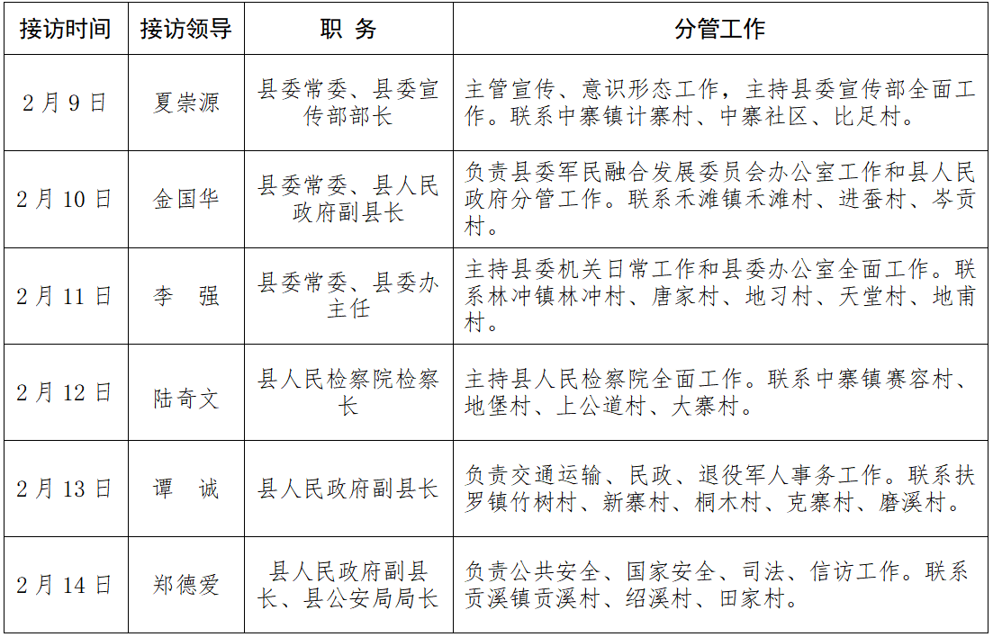 5.接访安排可能因工作冲突等原因进行调整。具体调整情况将在县群众信访接待中心公告栏公告。