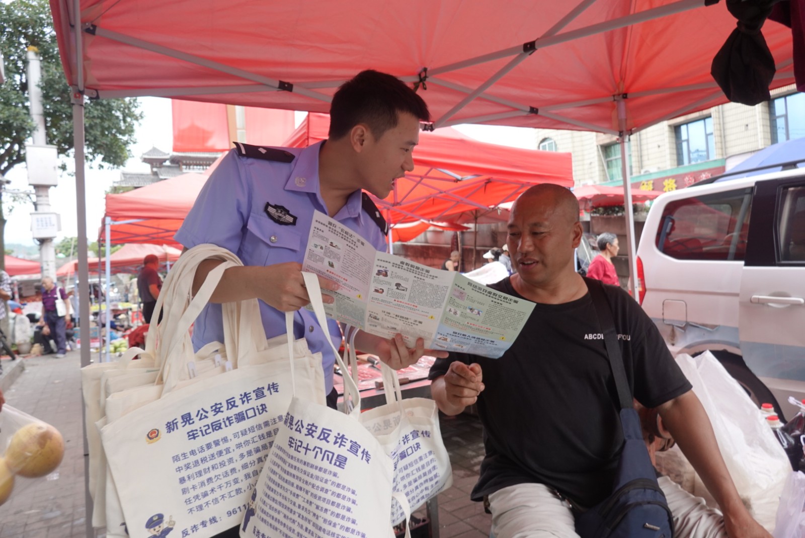 民警在集市入口、人员密集区域设立宣传点位,通过“物资发放+面对面讲解”的方式,向过往群众普及反诈知识。民警们一边向赶集群众递上印有反诈标语的宣传手册、实用帆布袋和清凉团扇,一边结合近期高发的电信网络诈骗案例,用通俗易懂的方言讲解“刷单返利”“冒充客服退款”“虚假投资理财”等诈骗类型。