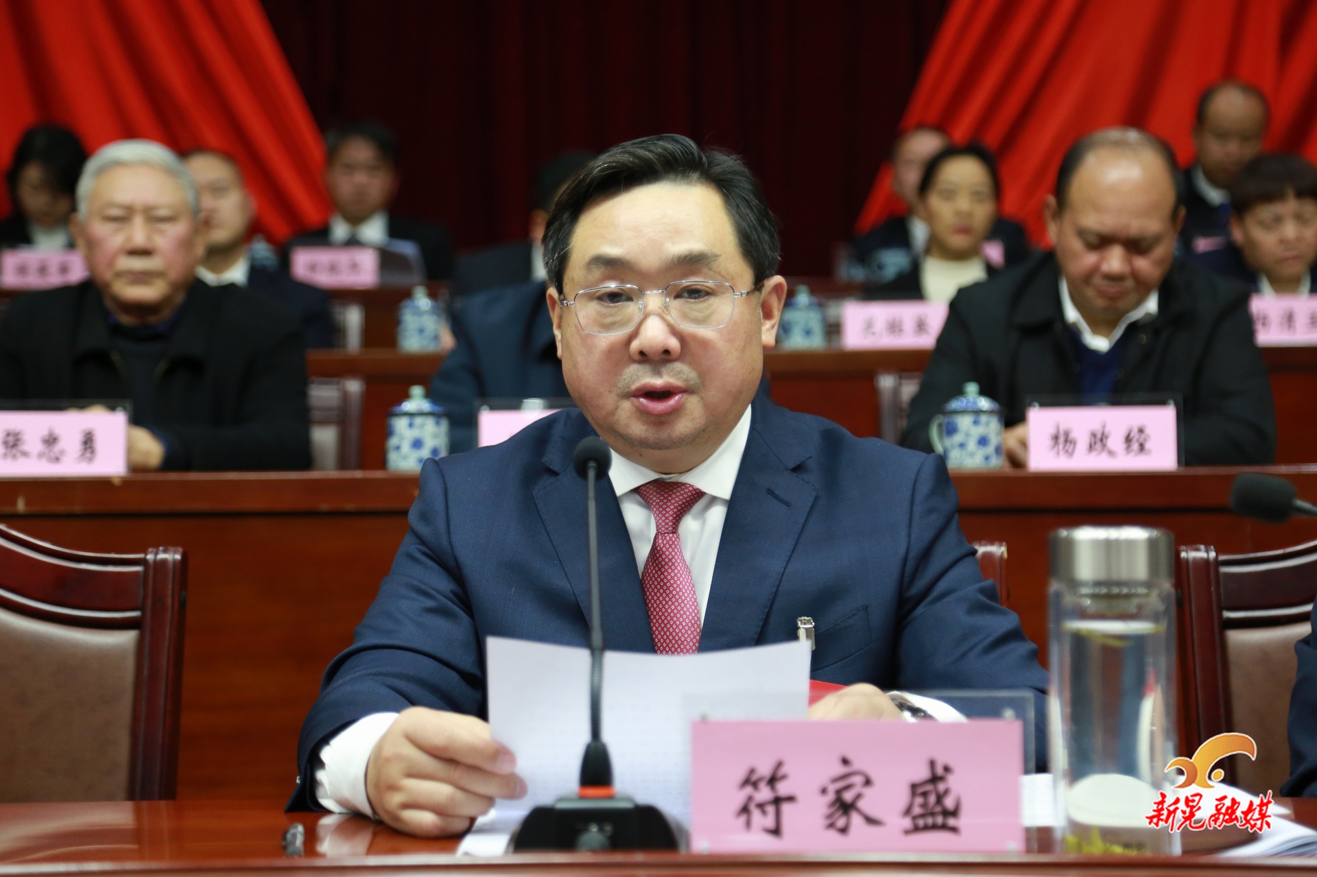 大会执行主席:符家盛、杨鹏、潘世新、彭仕华、赵欣、刘清云、袁勇、杨波澜及县政协党组书记、主席田新益在主席台前排就座。