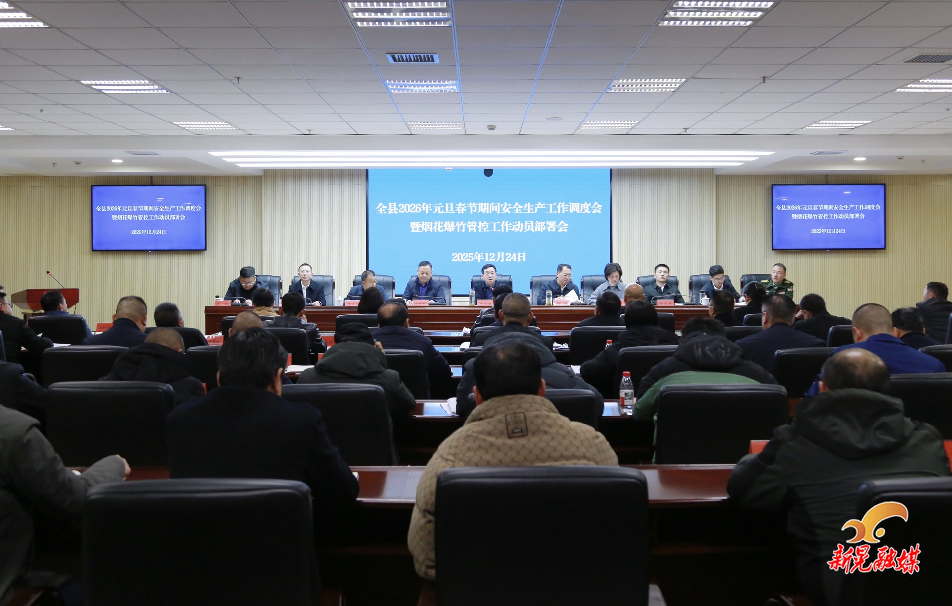 新晃融媒12月25日讯(记者:向勇嘉 杨清廉)12月24日,我县召开2026年元旦春节期间安全生产工作调度会暨烟花爆竹管控工作动员部署会,传达学习习近平总书记重要指示精神及省、市烟花爆竹管控工作会议精神,全面分析当前安全形势,全面部署“双节”期间安全生产与烟花爆竹管控工作。县委书记符家盛出席并讲话,县领导杨鹏、潘世新等参加。